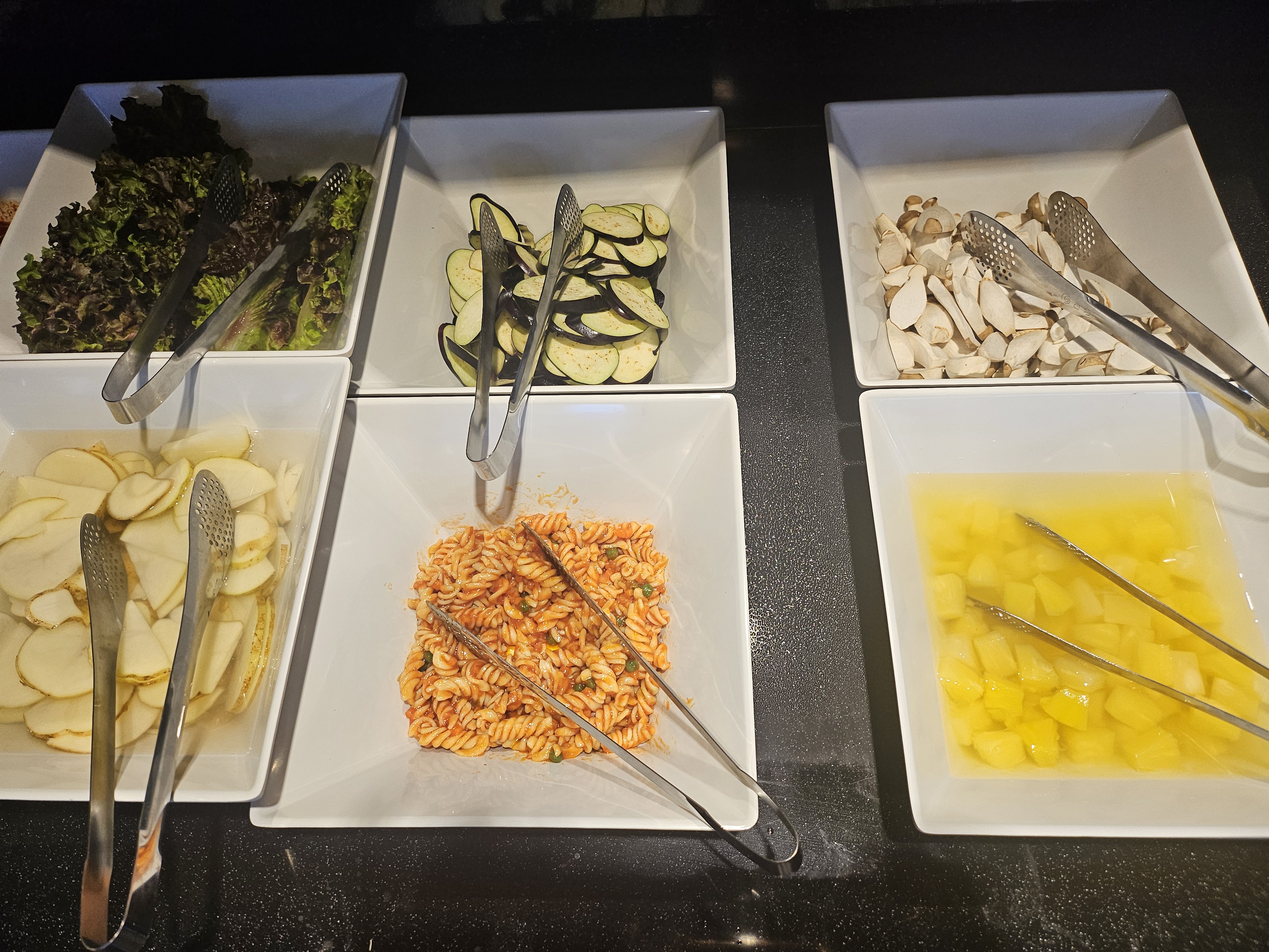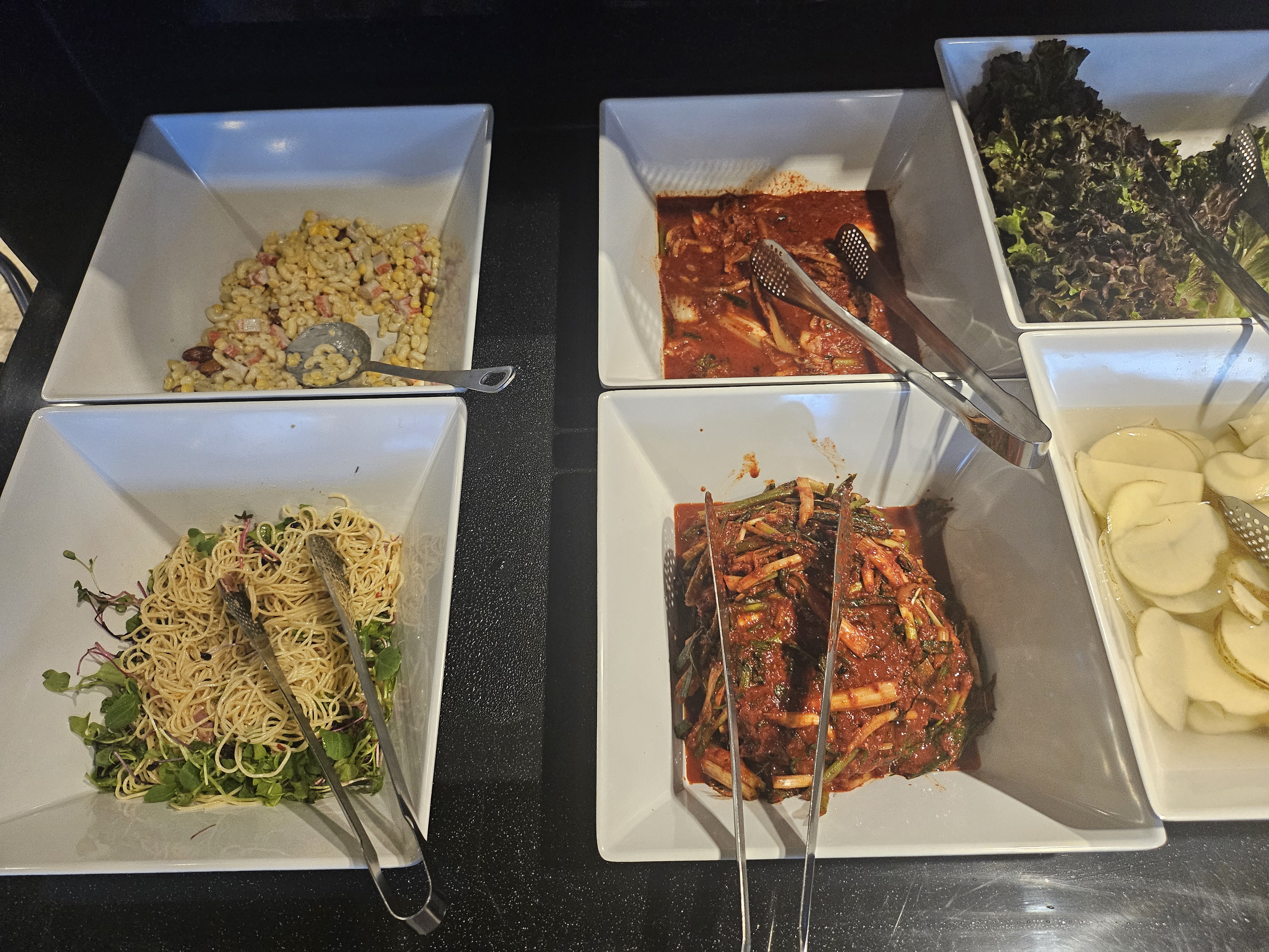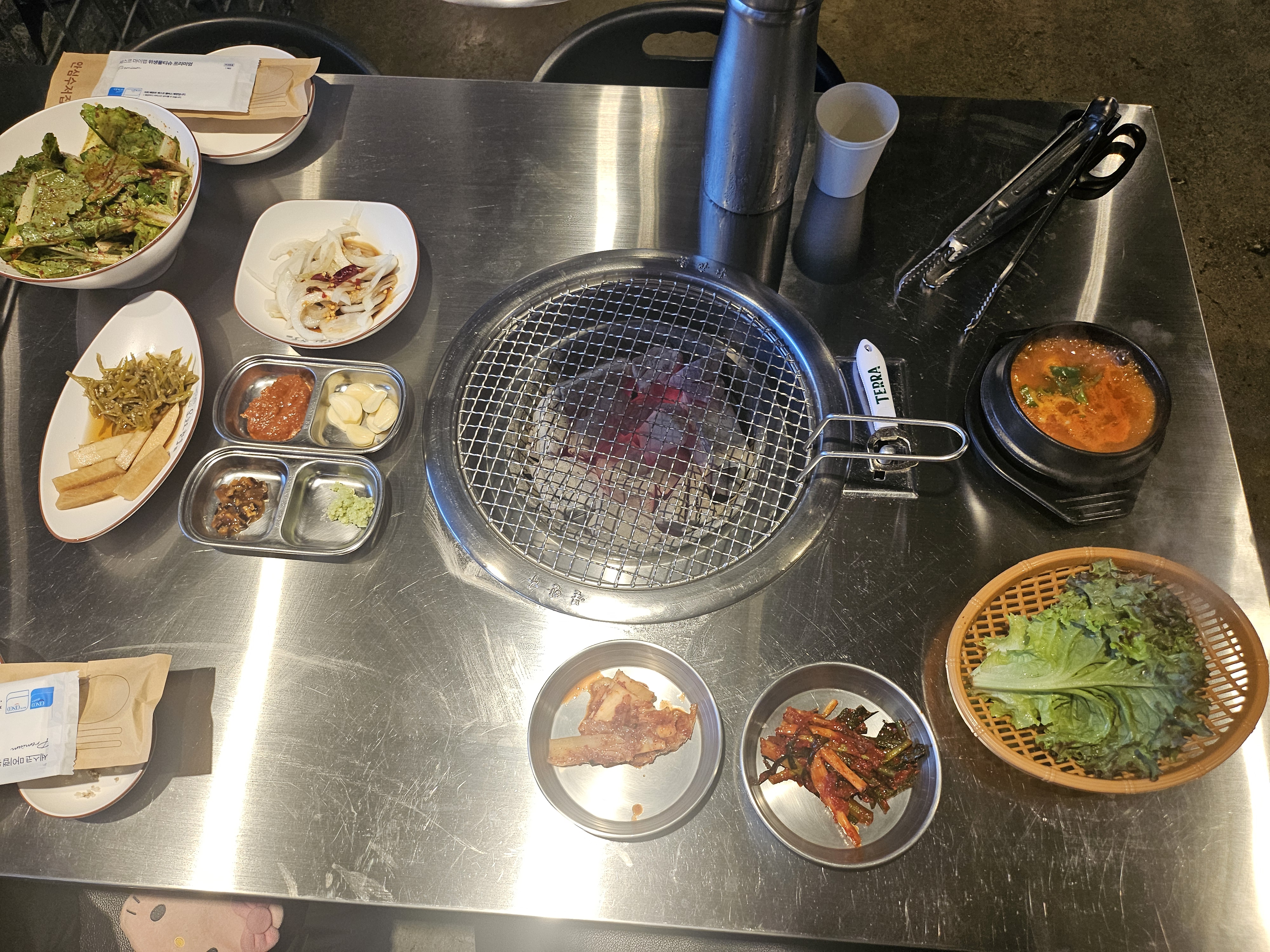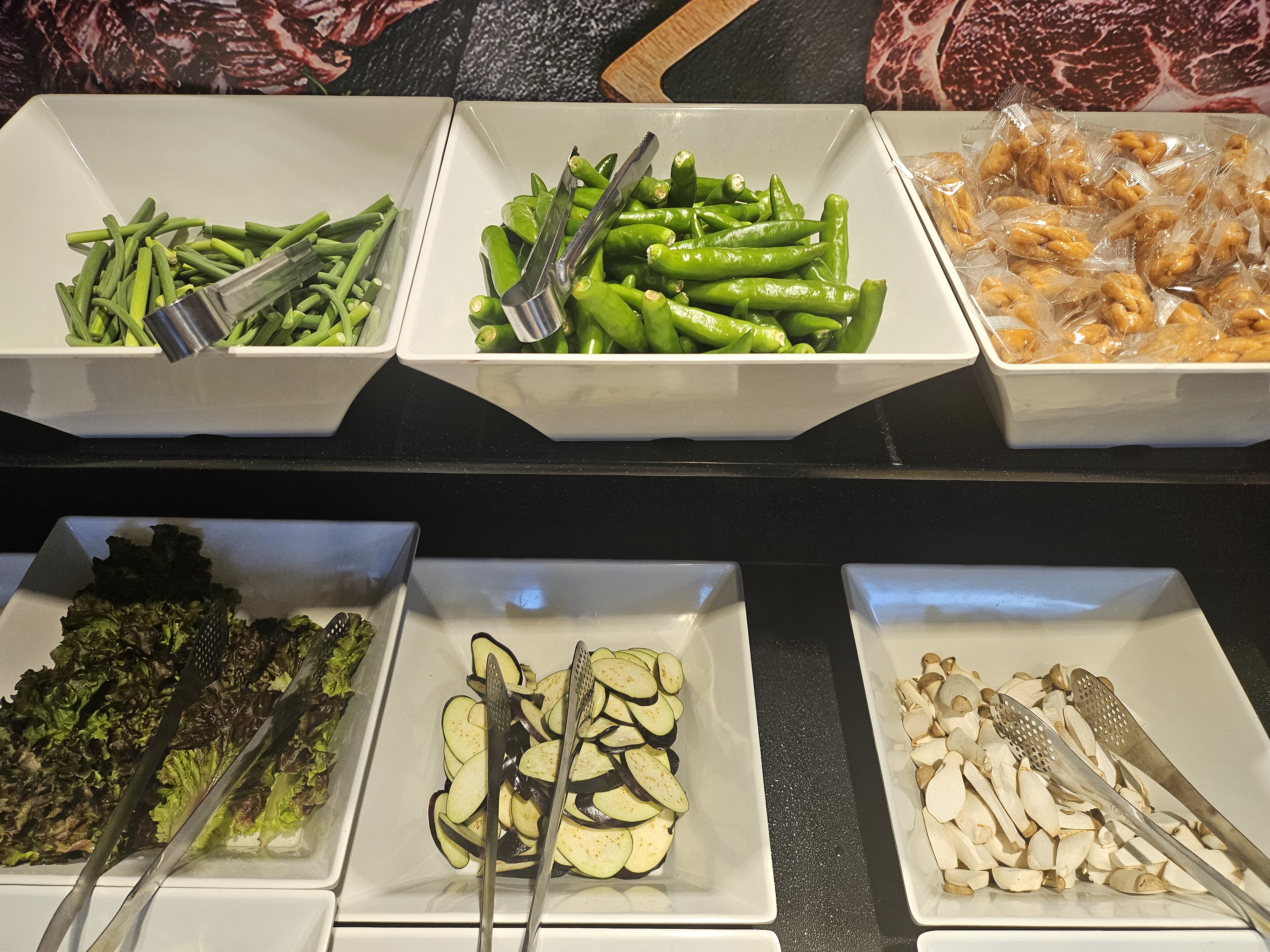 고깃집에서 이렇게 구성 잘 된 샐러드바가 있는 곳은 흔치 않은데, 여기엔 각종 밑반찬부터 신선한 채소, 그리고 구워 먹을 수 있는 가지구이와 마늘쫑까지 정말 다양하게 준비되어 있었어요. 눈치 보지 않고 원하는 만큼 리필할 수 있어서 친구랑 둘이 신나게 가져다 먹었어요. 특히 가지구이와 마늘쫑은 고기랑 같이 구워 먹으니 고기의 느끼함을 잡아주고 풍미도 더해줘서 계속 손이 가더라고요.