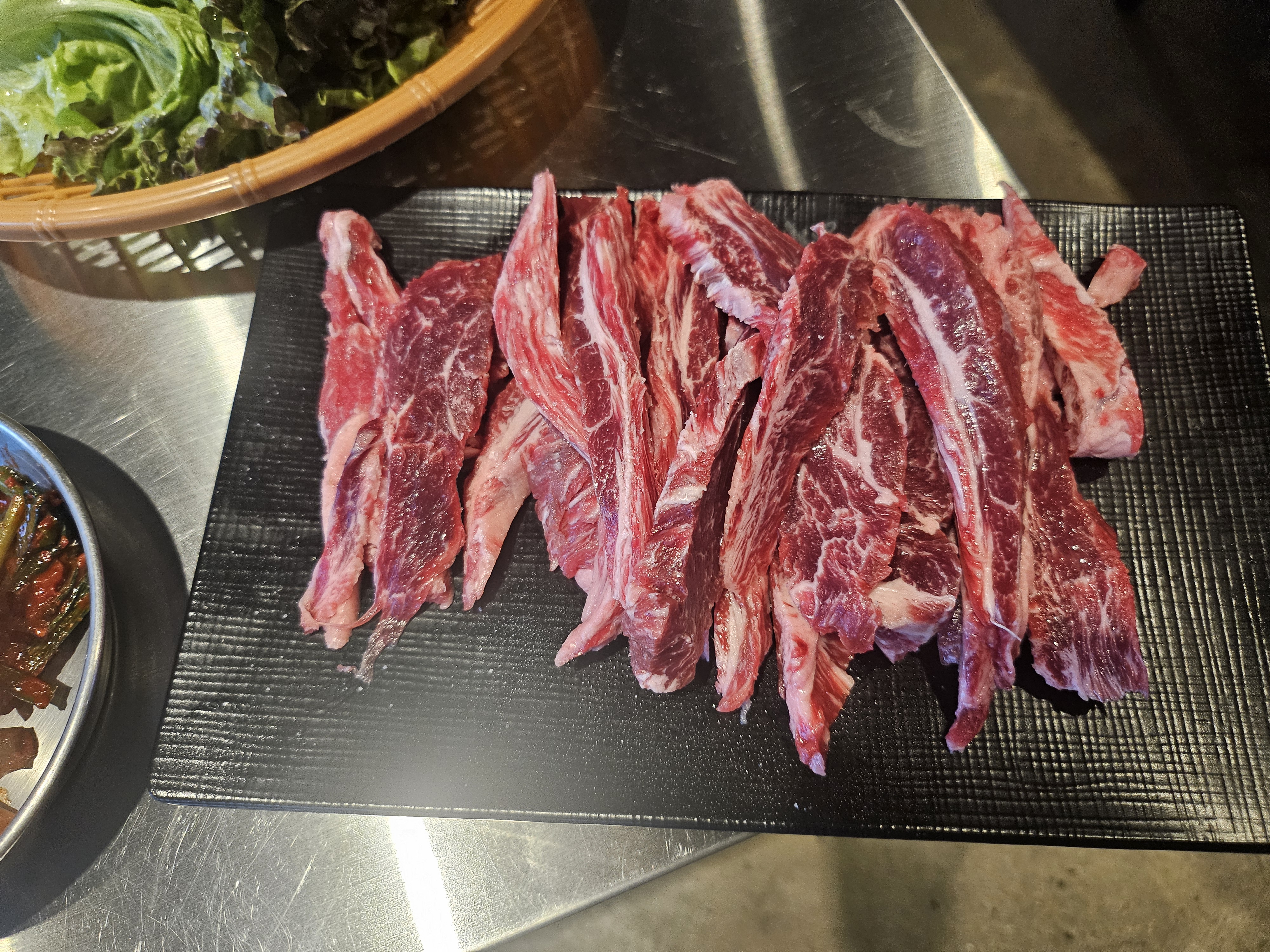 먼저 고기부터 소개할게요. 한우 갈비살은 정말 부드럽고 육즙이 가득했어요.