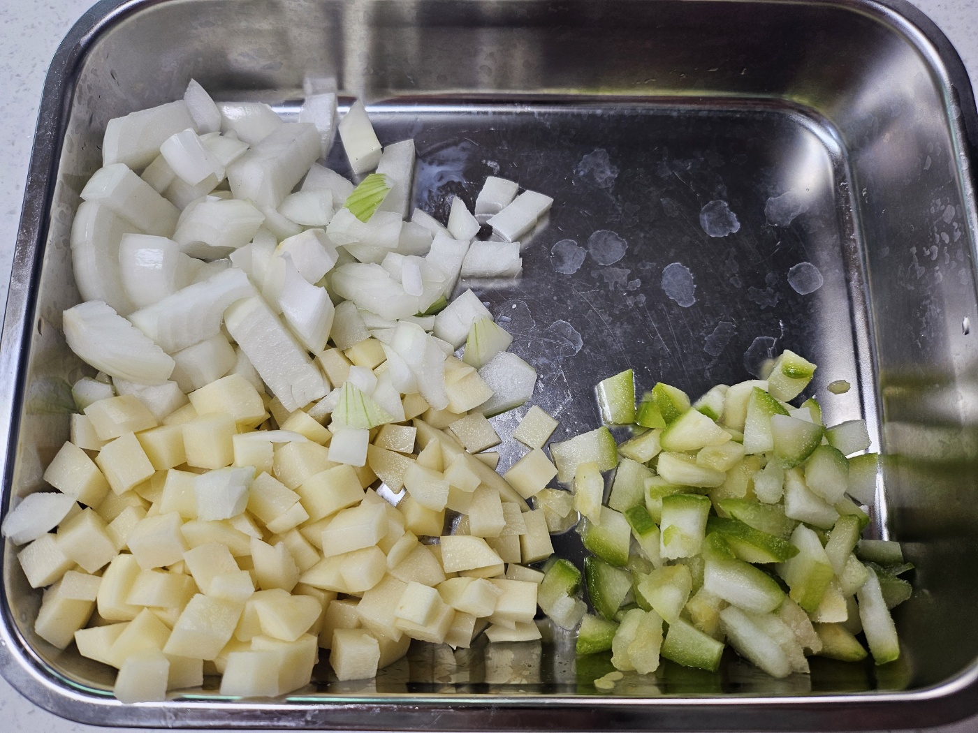 • 감자, 양파, 애호박은 잘게 깍둑 썰어요.