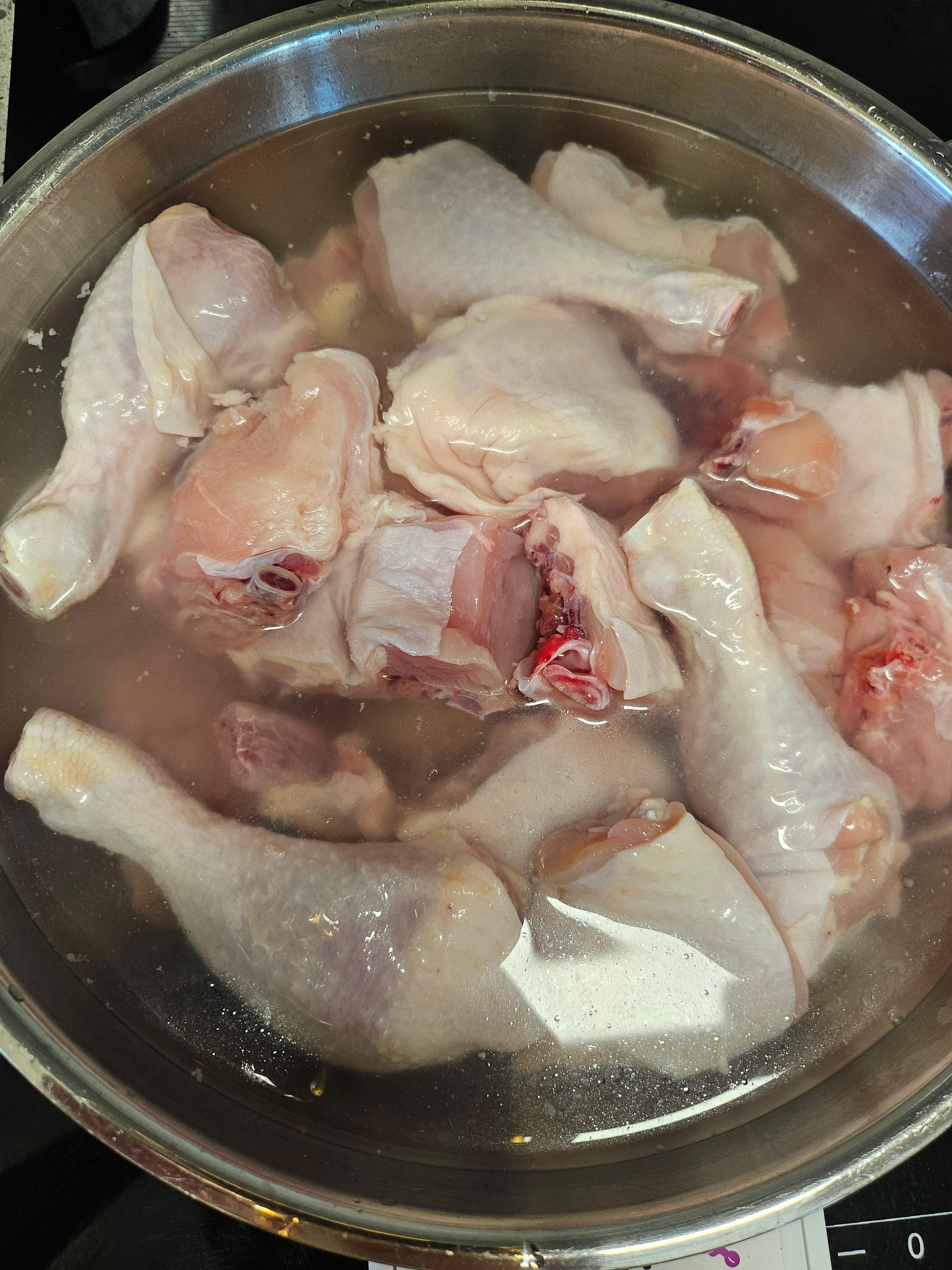 • 닭은 깨끗이 씻어 한 번 데쳐 잡내를 제거하고 체에 밭쳐둡니다.