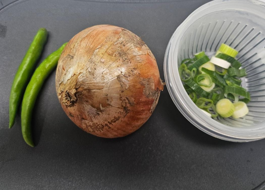 - 양파와 고추를 위에 올려 풍미를 더해요.