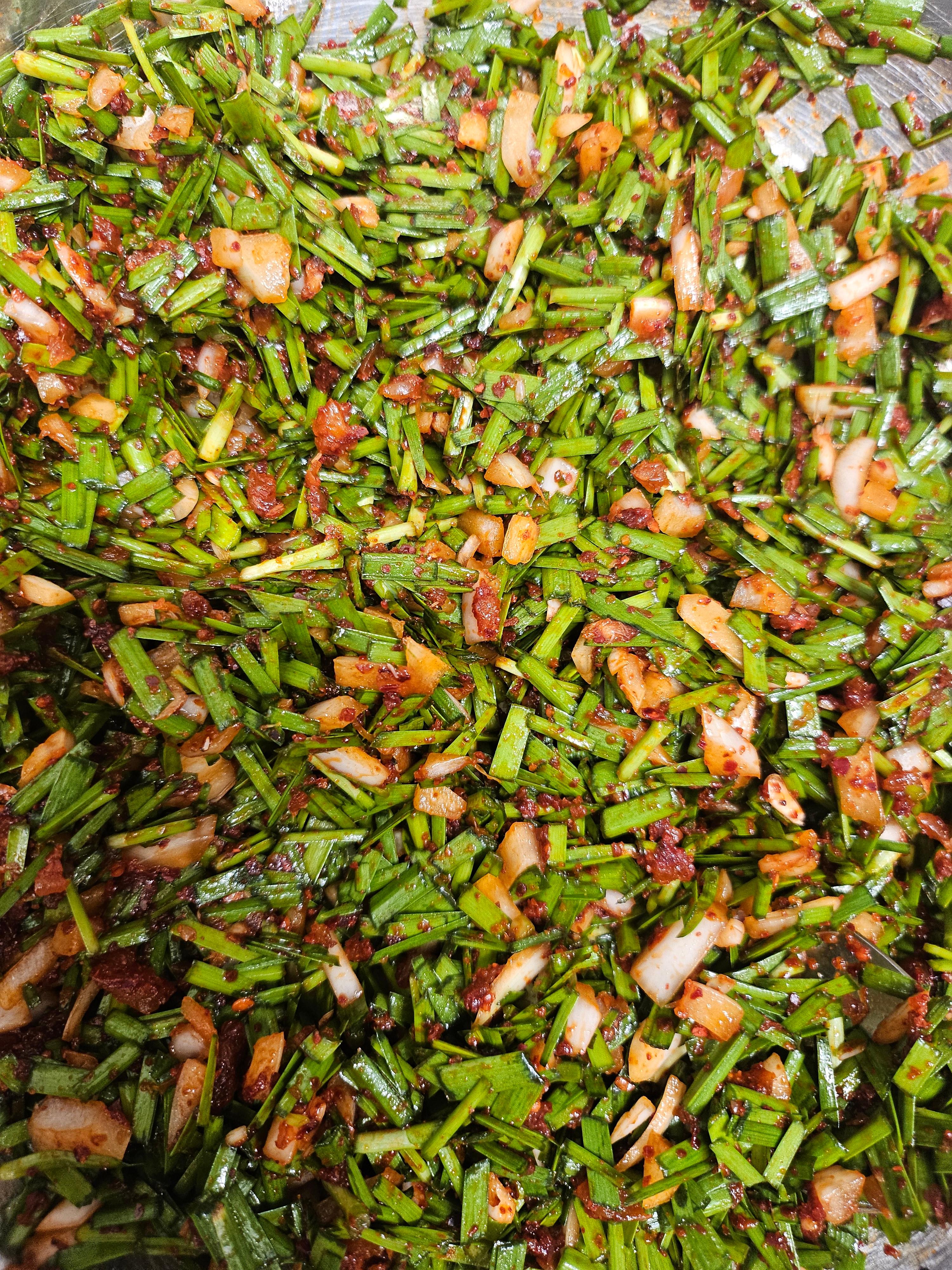 - 부추는 2cm 길이로 썰고, 양파도 가늘게 채 썰어요.