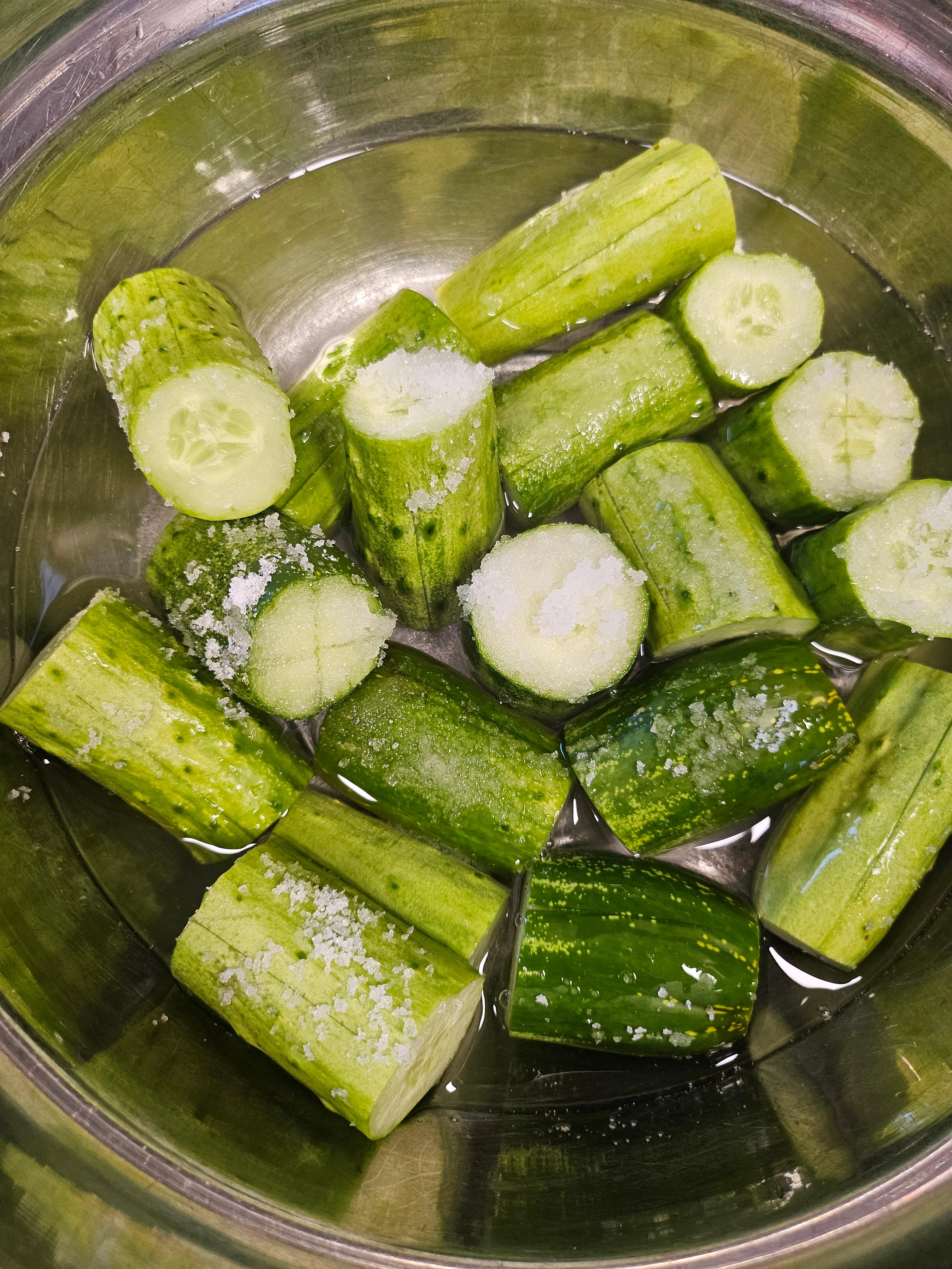 - 물 3컵에 굵은소금 2큰술을 풀고 오이를 넣어