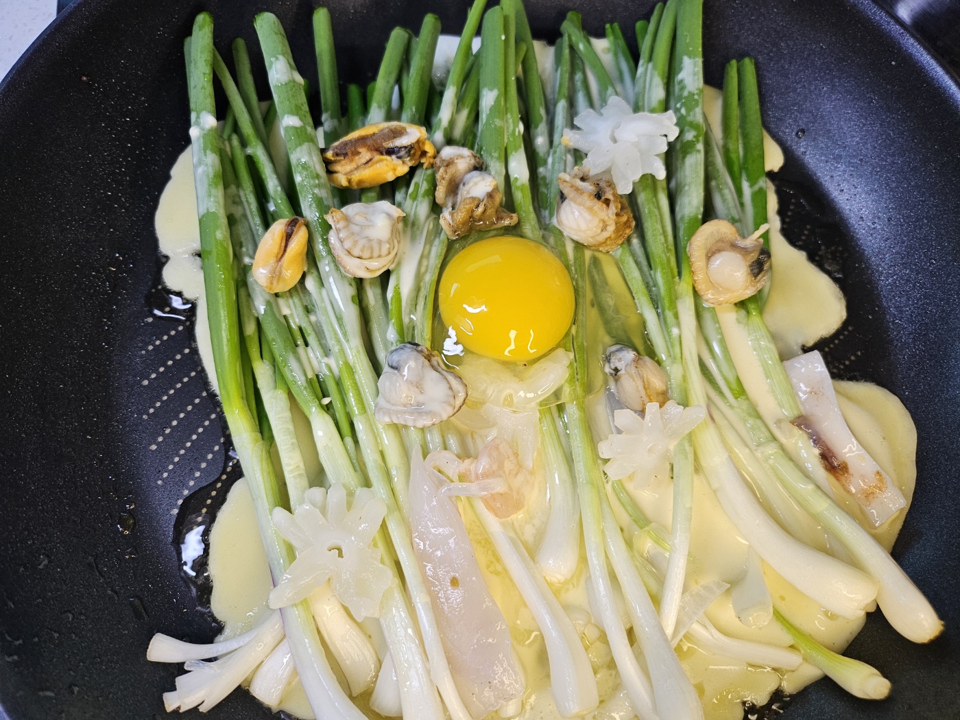 노른자를 터뜨려 굽는 파전은