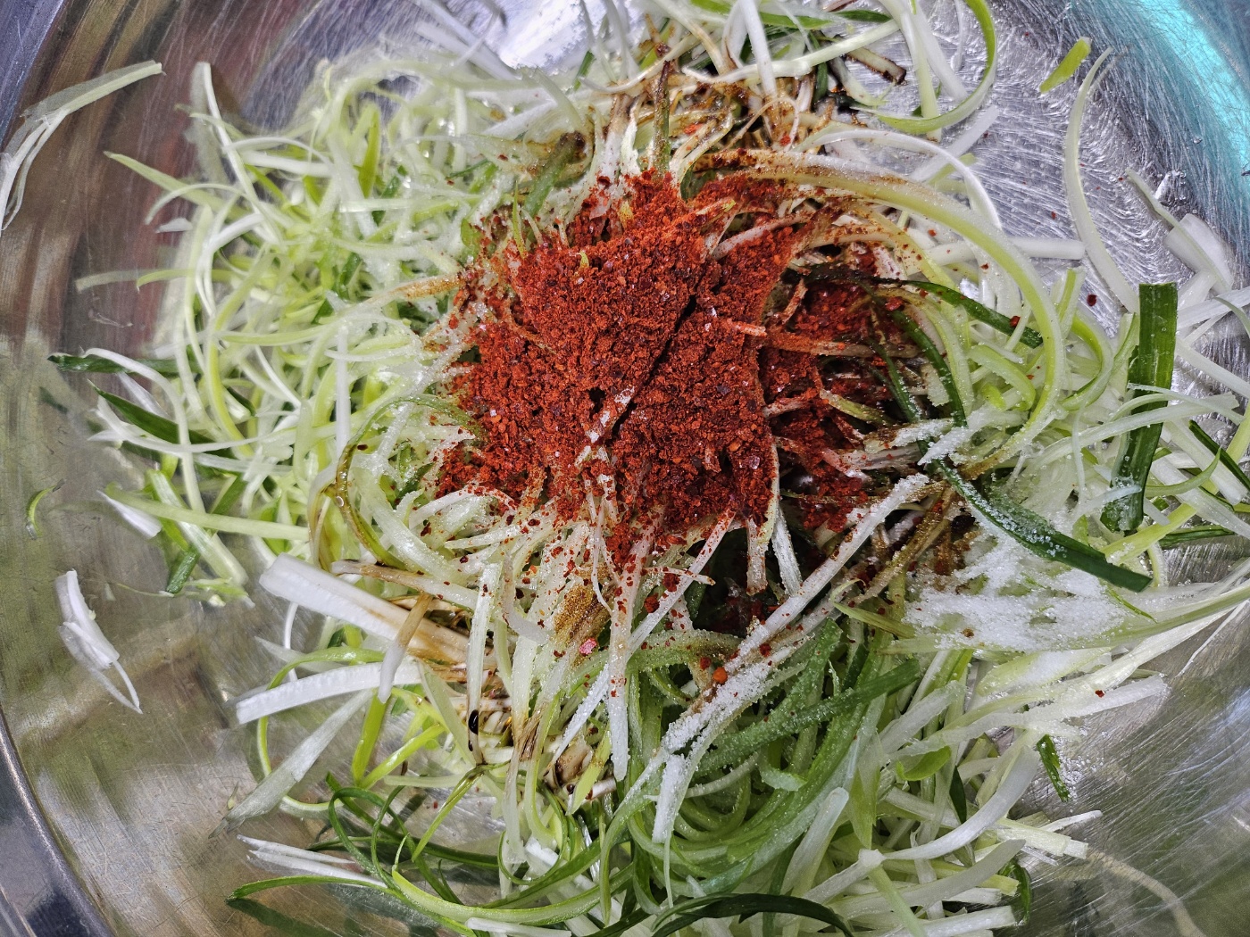 • 물기 뺀 실파를 양념에 넣고 가볍게 버무려주세요.